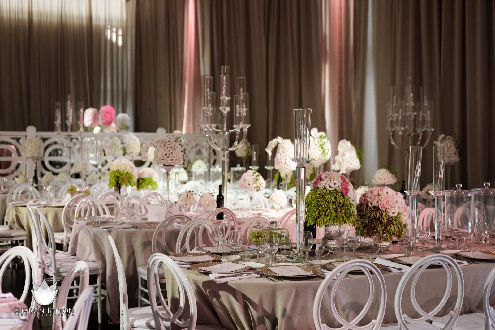 Naomi and Abraham’s wedding was a breathtaking display of timeless romance and high-end elegance. The ceremony, set against a stunning forest backdrop, featured a magnificent floral chuppah draped in lush greenery and white blooms, accompanied by the soulful sounds of a live orchestra. As the sun set, the celebration moved to a grand reception hall where the air was filled with luxury. Shimmering crystal candelabras, blush silk linens, and exquisite, sculptural floral arrangements in shades of white and soft pink created an atmosphere of pure enchantment. Every detail, from the ghost-chair seating to the meticulously curated table settings, reflected a perfect harmony of classical beauty and modern sophistication.