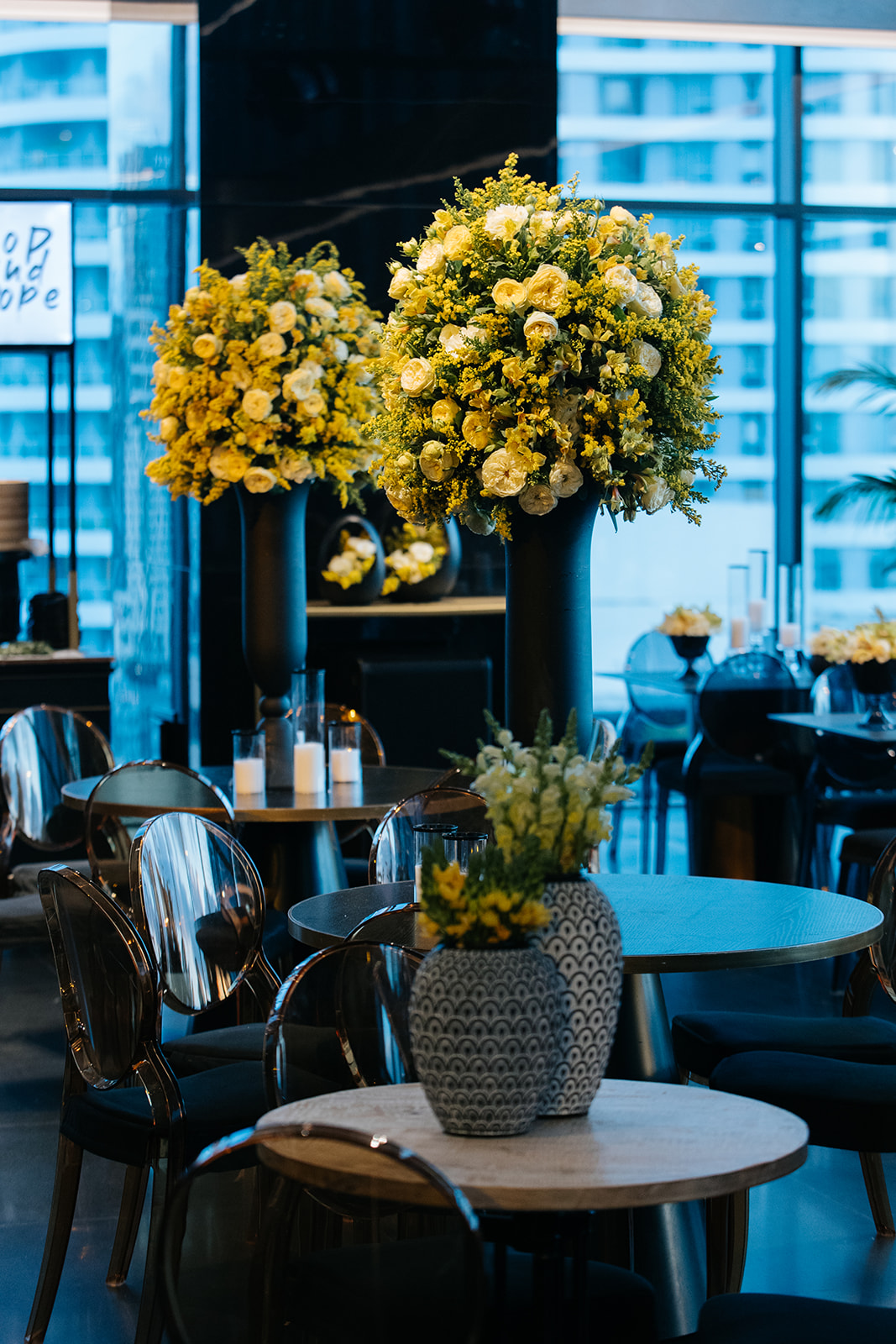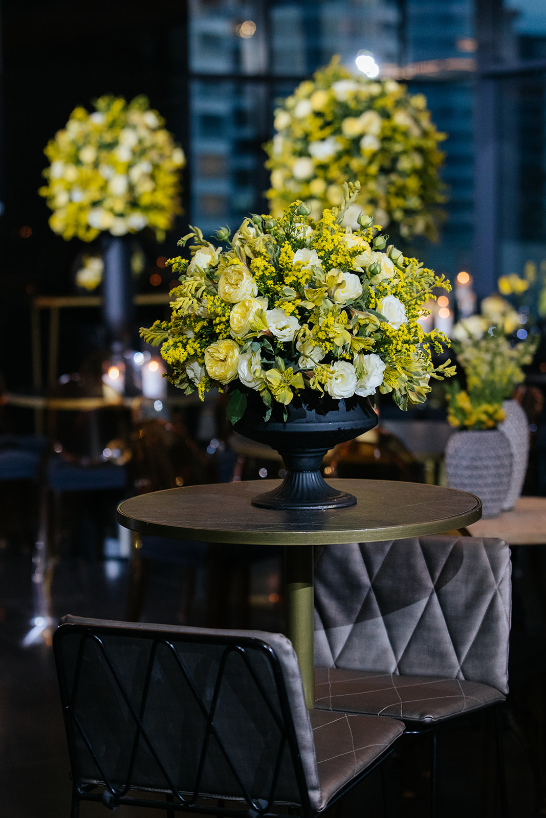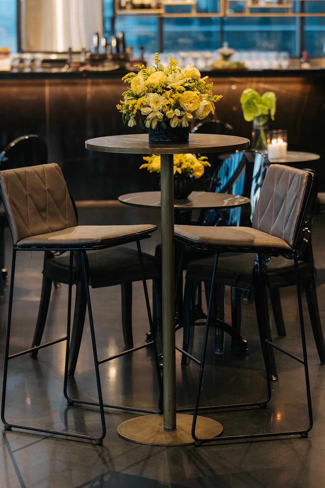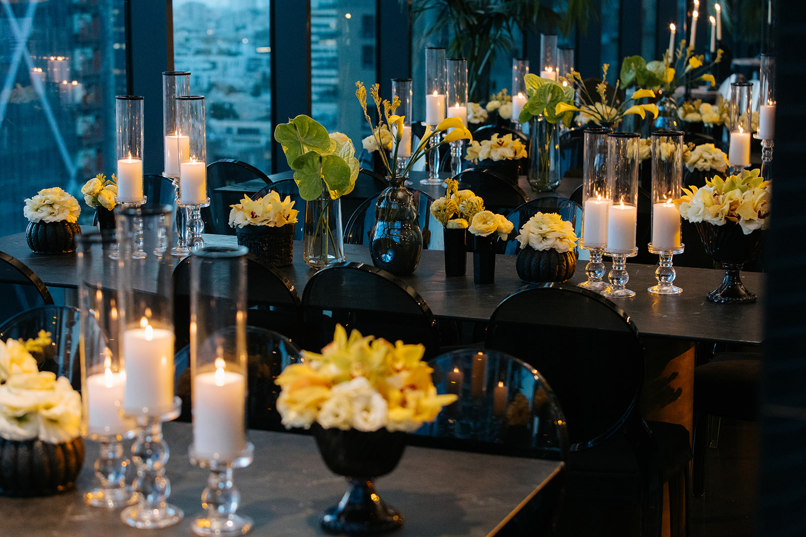 Vivian and Shlomo’s Welcome Event was a striking celebration of modern urban luxury. Set against a breathtaking city skyline, the venue was transformed into a sophisticated space defined by a bold and chic color palette. Sleek black tables were adorned with vibrant yellow floral arrangements, featuring exotic orchids and calla lilies that created a stunning contrast with the soft glow of tall glass candlelight. The mix of contemporary furniture and lush, towering centerpieces perfectly set the tone for the wedding festivities—elegant, vibrant, and undeniably stylish.