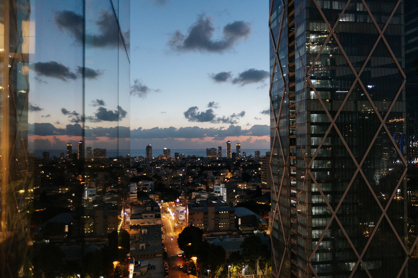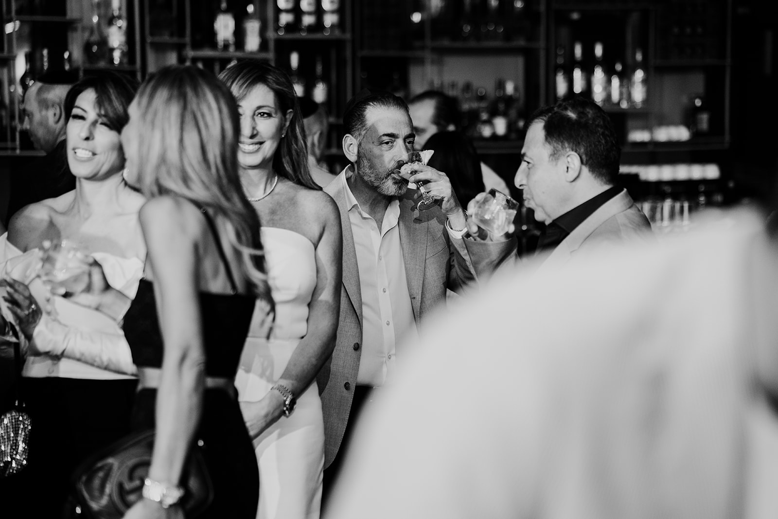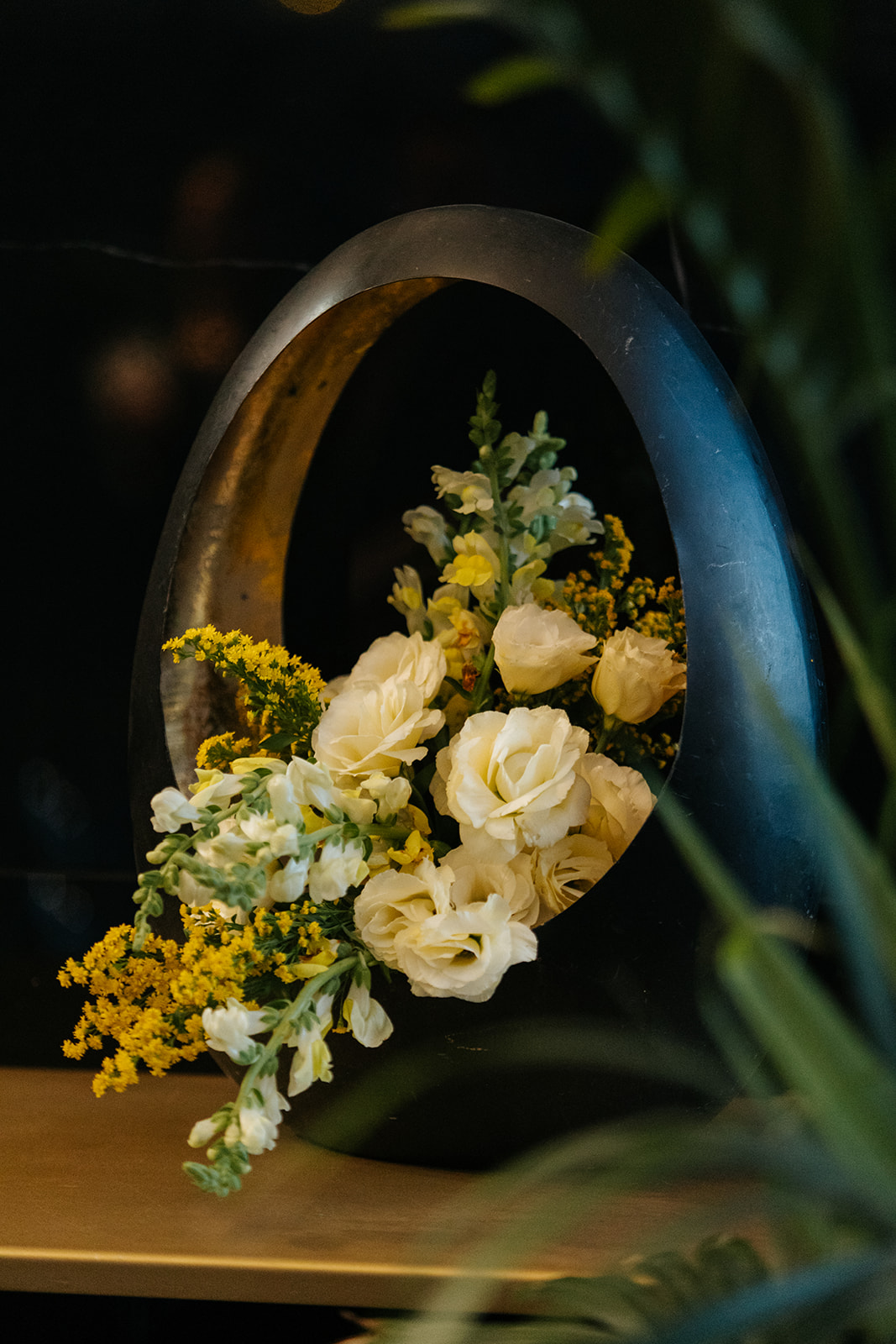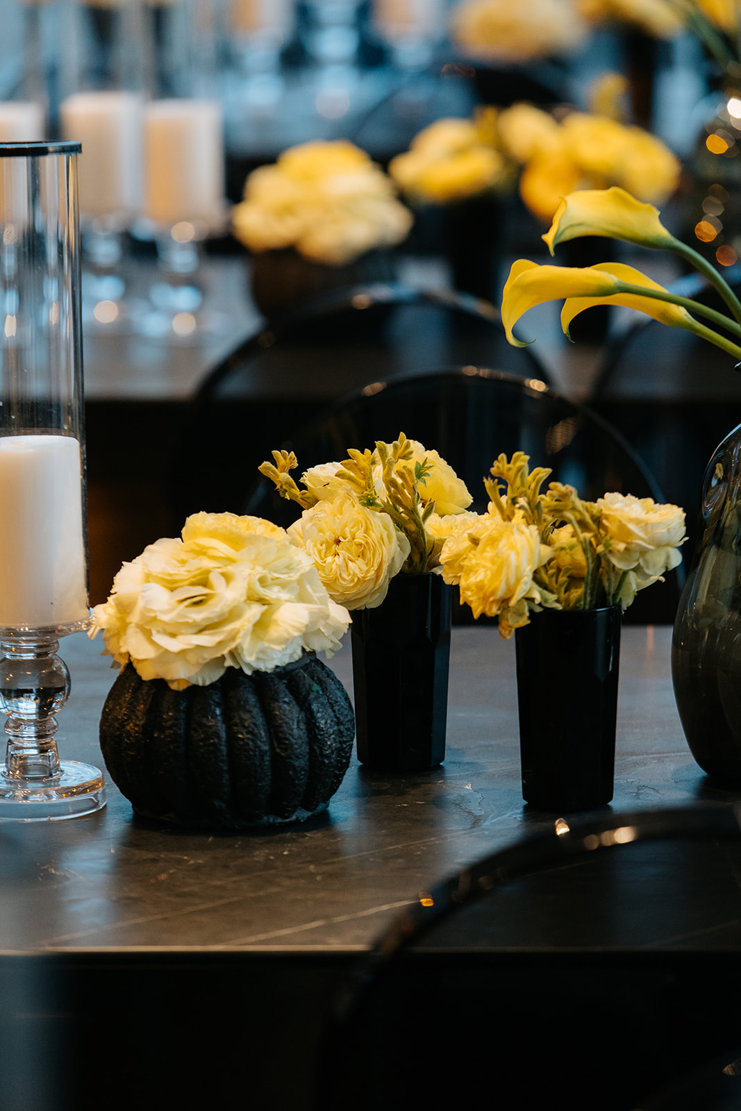Vivian and Shlomo’s Welcome Event was a striking celebration of modern urban luxury. Set against a breathtaking city skyline, the venue was transformed into a sophisticated space defined by a bold and chic color palette. Sleek black tables were adorned with vibrant yellow floral arrangements, featuring exotic orchids and calla lilies that created a stunning contrast with the soft glow of tall glass candlelight. The mix of contemporary furniture and lush, towering centerpieces perfectly set the tone for the wedding festivities—elegant, vibrant, and undeniably stylish.